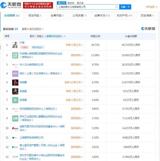 天眼查数据显示,公司的法定代表人、最大股东为笑果文化创始人、董事长叶烽,其持股比例34.73%;李瑞超(李诞)在笑果文化的持股比例为5.04%;上海普思投资有限公司持股比例为2.16%。