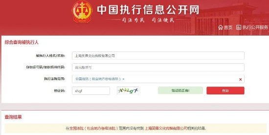 12月13日,中新经纬客户端在中国执行信息公开网被执行人查询中搜索“上海笑果文化传媒有限公司”,查询结果显示:“在全国法院(包含地方各级法院)范围内没有找到上海笑果文化传媒有限公司相关的结果。”