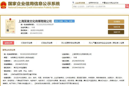 国家企业信用信息公示系统显示,上海笑果文化传媒有限公司成立于2014年5月29日,注册资本约189.21万元,公司经营范围包括文化艺术交流策划,影视策划,广播电视节目制作,电影制片,电影发行,文艺创作与表演,演出经纪等。