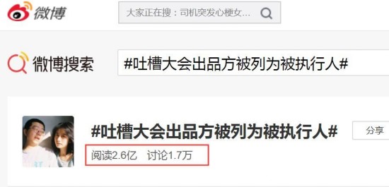 12月5日,相关媒体曝光该事件后,#吐槽大会出品方被列为被执行人#话题迅速登上微博热搜,截至目前,该话题阅读量达2.6亿,讨论1.7万。