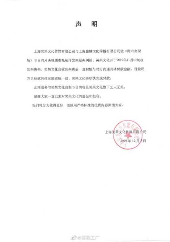 12月5日下午,微博认证信息为上海笑果文化传媒有限公司的“笑果工厂”微博回应称,公司与上海鑫麟文化传播有限公司就《周六夜现场》节目的片头视频委托制作发生服务纠纷,笑果文化已于2019年11月中旬收到判决书。