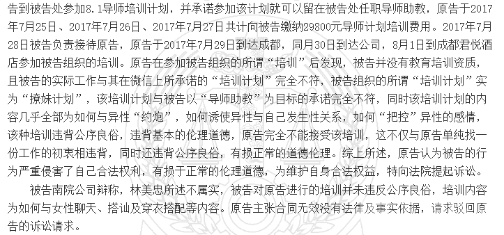 判决书中大多写道,原告在参加被告成都南院文化传播有限公司组织的所谓“培训”后发现,被告组织的所谓“培训计划”实为“撩妹计划”,该培训与被告以“导师助教”为目标的承诺完全不符,同时该培训计划的内容几乎全部为如何与异性“约炮”,如何“把控”异性的感情,违反公序良俗,违背基本的伦理道德。而法院审理后发现,证据内容显示其培训内容确实违反公序良俗。