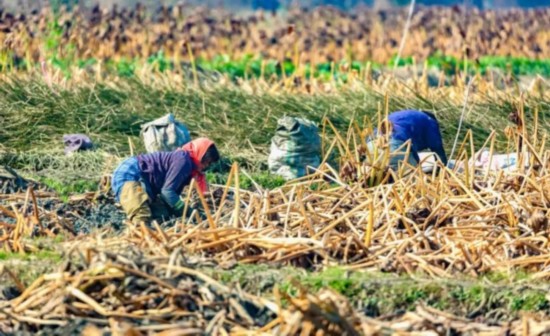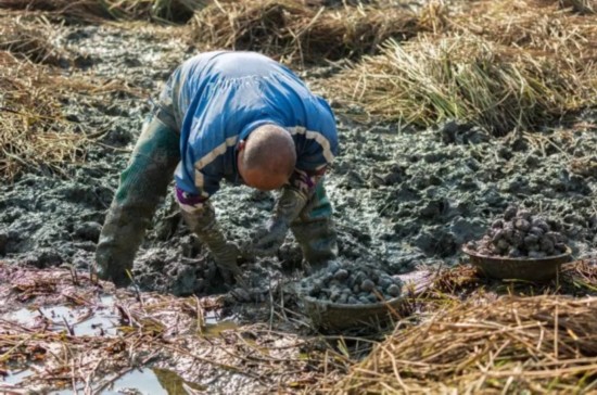 顾不上寒冷,农民们穿着套鞋,深一脚浅一脚地踩在水田里,将茨菇与荸荠尽数从泥地里“揪”出来。