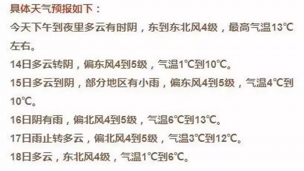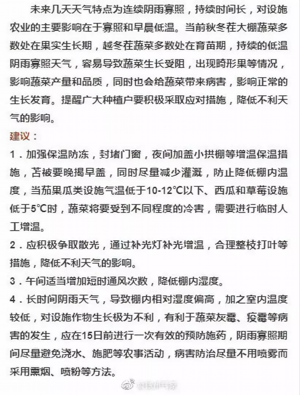 另外,13到14日、16到17日分别有冷空气扩散南下,冷空气影响时风力有所增大,可达4到5级,后期气温将有所下降,20日早晨最低气温-3℃左右。未来多阴雨天气,光照偏少,请注意防范。