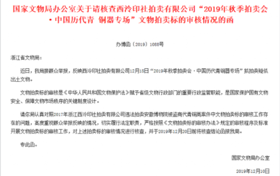 记者注意到,在国家文物局的函件中,还特别提到要求浙江省文物局认真对照2017年浙江西泠印社拍卖有限公司违法拍卖安徽博物院被盗商代青铜鬲案件中的文物以及拍卖标的审核工作存在的问题,高度重视群众举报反映的情况,切实履行法定职责,严格按照《文物拍卖标的审核办法》规定的审核程序及标准开展文物拍卖标的审核工作,对上述拍卖标的审核情况进行核查,并于2019年12月20日前将核查结论函报国家文物局。