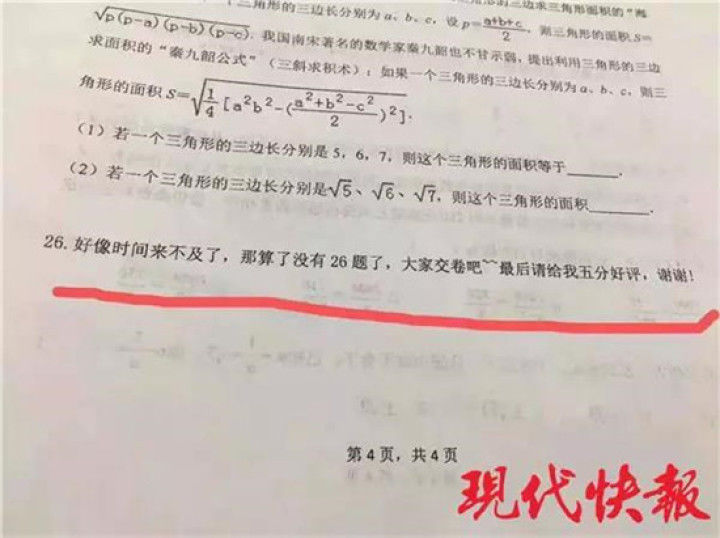 试卷最后还有一句调侃:“好像时间来不及了,那算了没有 26 题了,大家交卷吧。最后请给我五分好评,谢谢!”