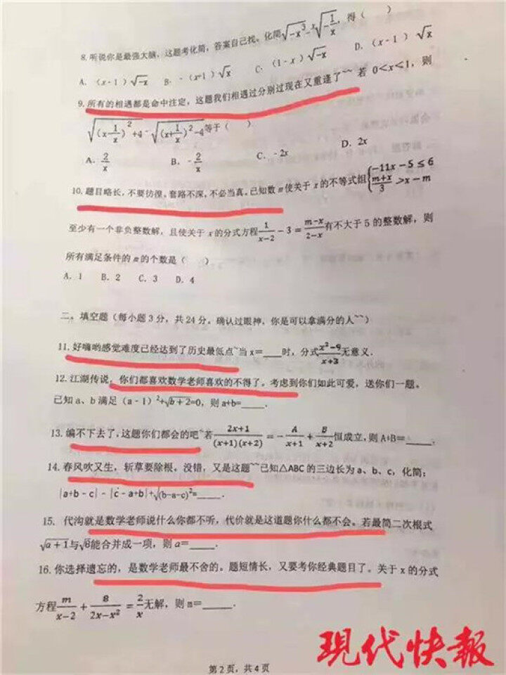 近日,南通一份用段子编的数学试卷火了,每道题前都有调侃的网络流行用语:“不是红颜易老,是你做题太少……”;“若无相欠、怎会相见。欠的多了,这题也就不会了。”不少同学表示 ,“数学老师的语文水平很高哟”!