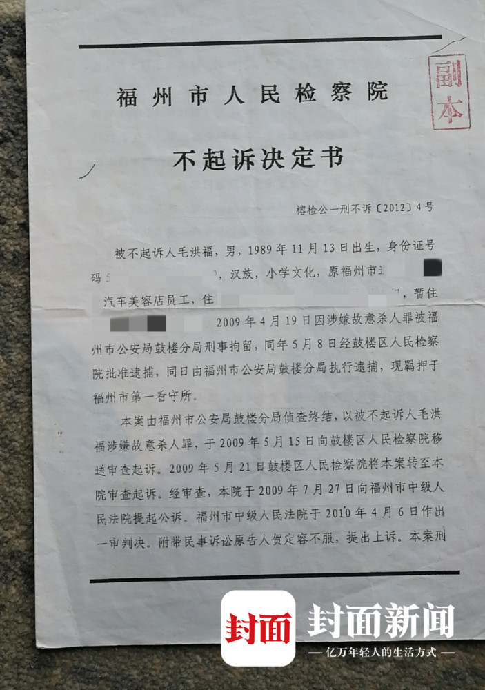 胡玉英第一次这么说,是在10年前。2009年5月15日,当郑剑飞的家属通过福州市公安局鼓楼分局的《起诉意见书》了解到毛洪福成为犯罪嫌疑人时,他们再也坐不住了。