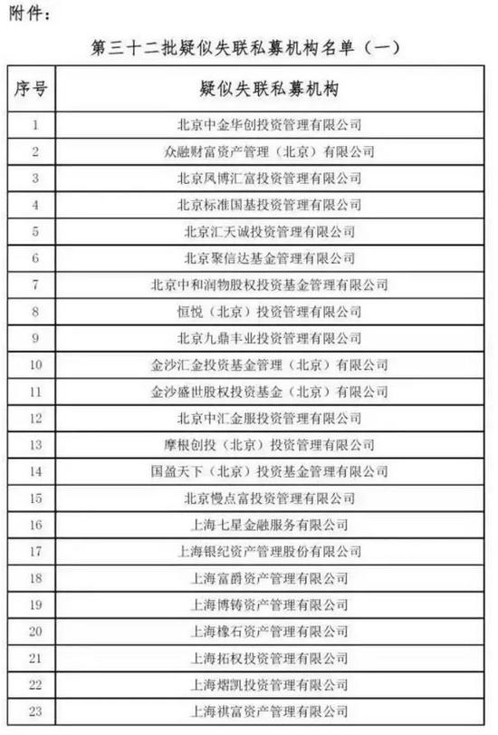 12月13日晚间,中国证券投资基金业协会发布第三十二批疑似失联私募机构名单,涉及北京中金华创投资、众融财富资产、国盈天下、中科汇通(上海)资产等30家机构。