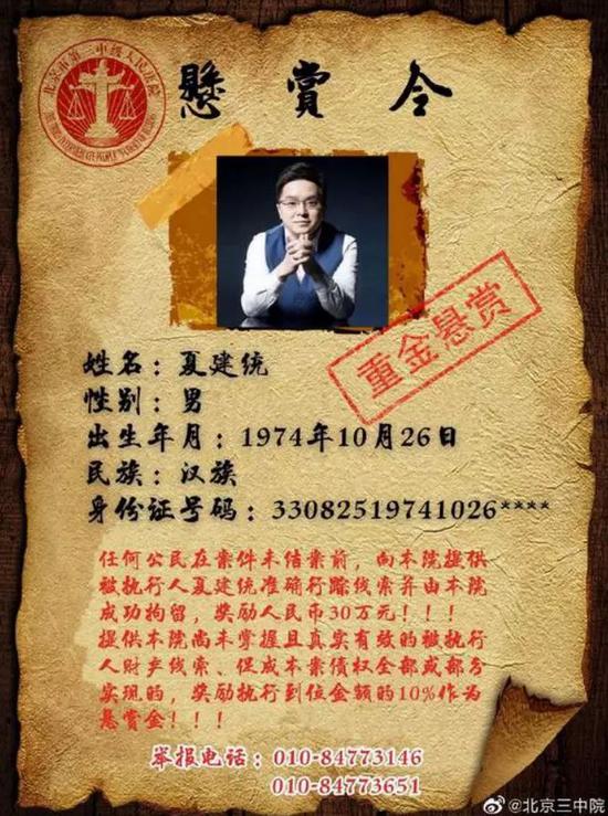 在发现夏建统失联后,法院对他采取限制出境等措施,但至今仍未找到。今年10月17日,北京三中院发布悬赏通告。通告显示,夏建统,1974年10月26日出生。任何公民在未结案前,向法院提供被执行人夏建统准确行踪线索并由法院成功拘留,悬赏人民币30万元;提供法院尚未掌握且真实有效的被执行人财产线索,促使该案债权全部或部分实现的,奖赏执行到位金额的10%作为赏金。