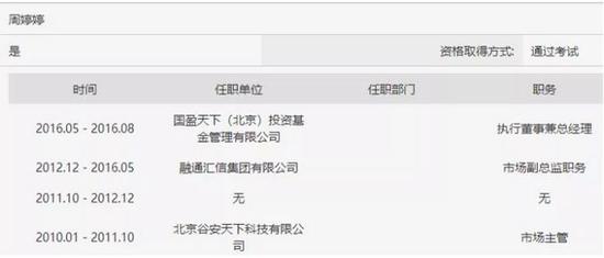 天眼查信息显示,国盈天下(北京)投资基金管理有限公司成立于2016年,注册资本5亿元,公司股东是自然人韩福爱和白海玉,分别持股51%、49%。基金业协会备案信息也显示,国盈天下的法人周婷婷,曾经担任融通汇信集团市场副总监。