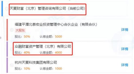 天眼查信息显示,众融财富资产管理(北京)有限公司成立于2014年10月14日,注册资本3000万元。其对外投资的公司包括“天夏财富(北京)管理咨询有限公司”,占股40%,另外两大股东为福建平潭北泰宏业投资管理中心合伙企业(有限合伙)、杭州天夏科技集团有限公司。