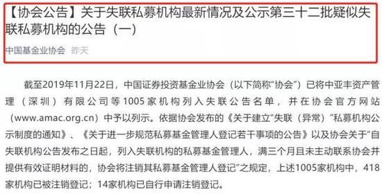 基金业协会表示,截至2019年11月22日,协会已将中亚丰资产管理(深圳)有限公司等1005家机构列入失联公告名单,并在协会官方网站(www.amac.org.cn)中予以列示。依据协会发布的《关于建立“失联(异常)”私募机构公示制度的通知》、《关于进一步规范私募基金管理人登记若干事项的公告》以及协会关于“自失联机构公告发布之日起,列入失联机构的私募基金管理人,满三个月且未主动联系协会并提供有效证明材料的,协会将注销其私募基金管理人登记”之规定,上述1005家机构中,418家机构已被注销登记;14家机构已自行申请注销登记。