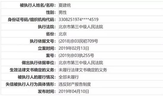 如今,夏建统被多地法院列为“失信被执行人”,即俗称的“老赖”,包括北京第三中级人民法院、杭州市中级人民法院等,还有无锡市中级人民法院、杭州市滨江区人民法院等下发了“限消令”,禁止夏建统进行高消费。