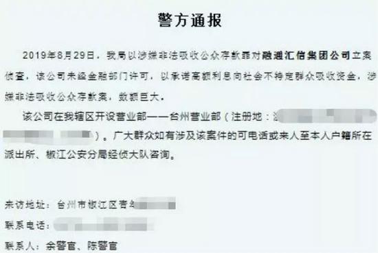 但是,今年已有多地警方对融通汇信进行立案侦查。今年9月6日,台州市公安局椒江分局发布通报称,2019年8月29日,以涉嫌非法吸收公众存款罪对融通汇信集团公司立案侦查,该公司未经金融部门许可,以承诺高额利息向社会不特定群众吸收资金,涉嫌非法吸收公众存款案,数额巨大。