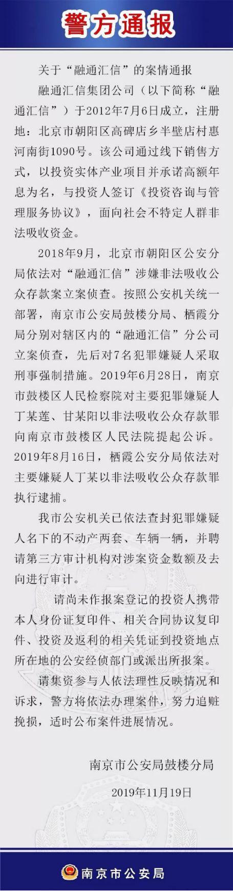 今年11月,南京鼓楼警方发布了警情通报,称融通汇信集团公司以投资实体产业项目并承诺高额年息为名,与投资人签订《投资咨询与管理服务协议》,面向社会不特定人群非法吸收资金。2018年9月,北京市朝阳区公安分局依法对“融通汇信”涉嫌非法吸收公众存款案立案侦查。按照公安机关统一部署,南京市公安局鼓楼分局、栖霞分局分别对辖区内的“融通汇信”分公司立案侦查,先后对7名犯罪嫌疑人采取刑事强制措施。