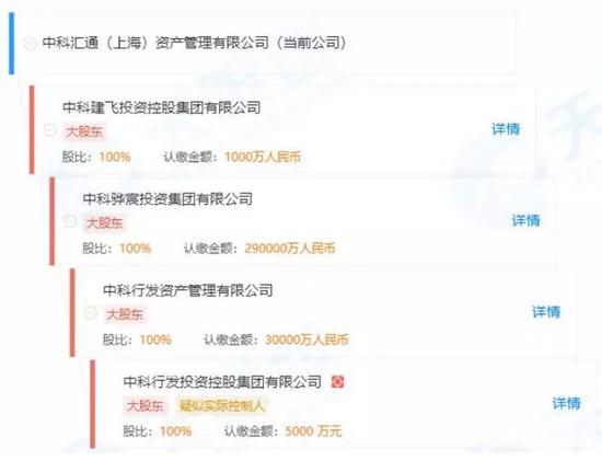 天眼查信息显示,中科汇通(上海)资产管理有限公司成立于2017年3月30日,注册资本为1000万元,法定代表人为熊萍。其由中科建飞投资控股集团有限公司100%控股,穿透股权关系可以发现,其疑似实控人为中科行发投资控股集团有限公司。