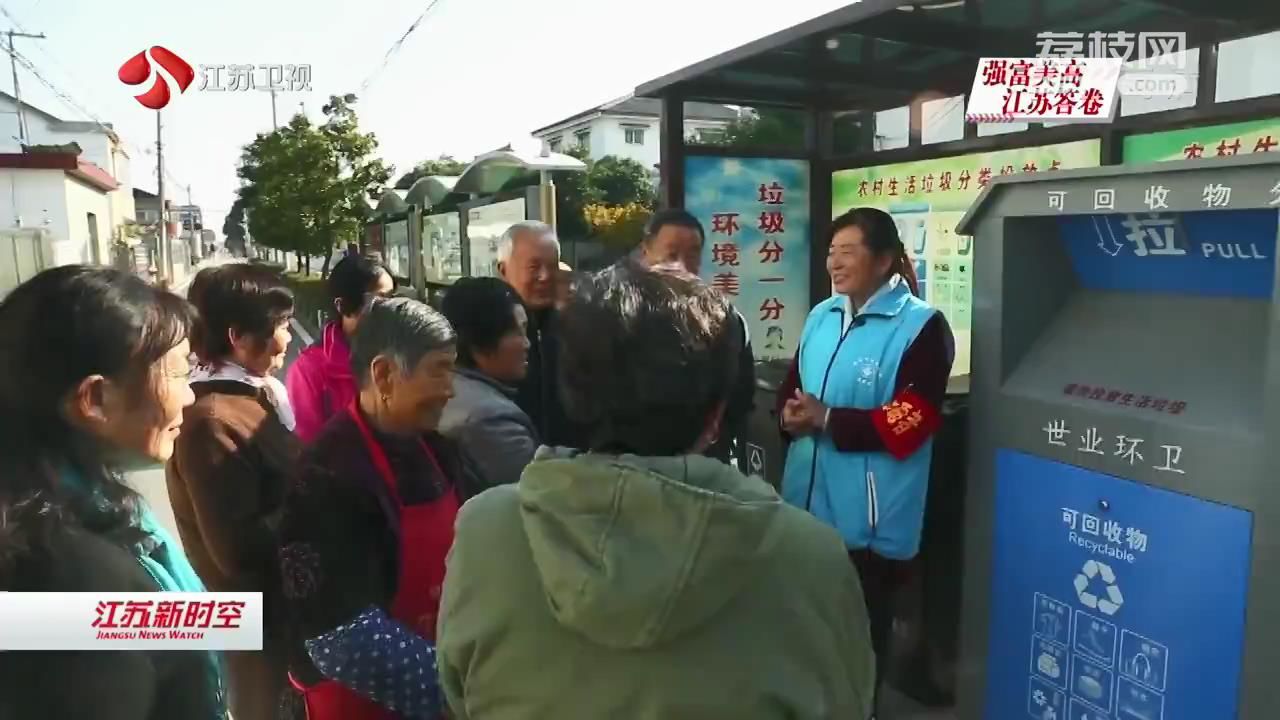 镇江世业洲镇永茂圩村,镇上志愿者正在为村民讲解垃圾分类,洪家勇参与其中。