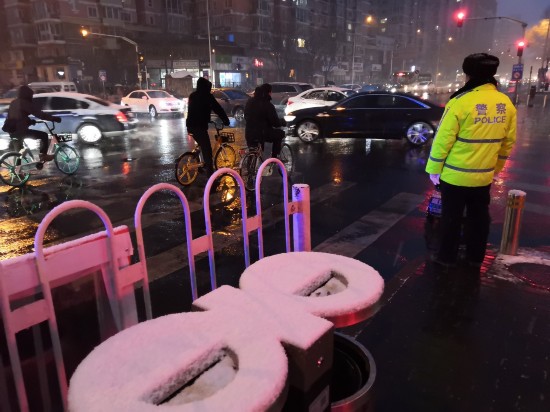 今天早上七点,五道口地铁站附近雪花纷飞,上班的人们陆续出门,交通民警在路口执勤。