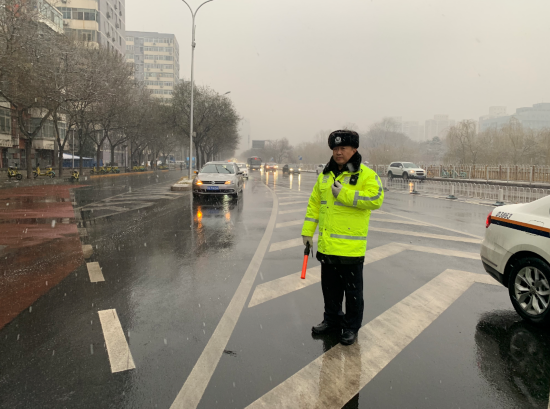 6点整,清河交通大队警长付志斌已经站在健翔桥西侧、四环路旁了。车子逐渐增多,雪花也赶在一起凑热闹,从小冰粒慢慢变成了鹅毛般的雪片,迎风站着,雪花不断打在眼睛上和嘴里,满身满脸湿漉漉的。他对记者说,这个岗设在桥区,就是怕出现结冰。“现在看还好,没有积雪,也没结冰,可能是刚才的冰粒湿度太大吧,落地就化。”