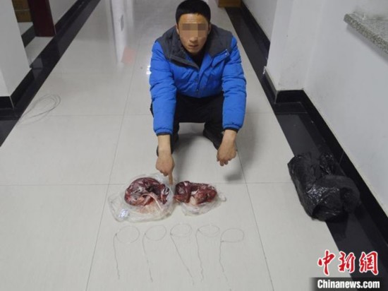 鉴于警方的威慑力,该男子主动从家中冰柜里拿出两只已经扒皮的野兔。
