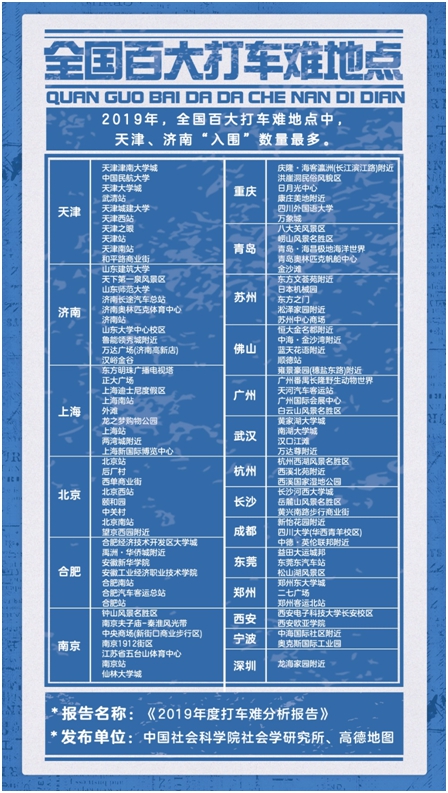 16日,中国社科院社会学研究所和高德地图联合发布的《2019年度打车难分析报告》显示,2019年全国主要城市100个打车难地点主要集中在华北和华东地区。