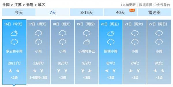 今天白天无锡市云系增多,而夜里起会多阴雨天气过程。预计今天夜里起受冷暖空气共同影响,无锡市将多阴雨天气过程,气温大幅下降,19日最高气温将重回个位数。