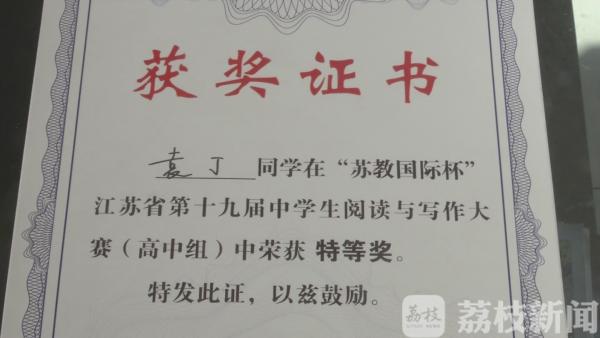 12月15日在袁丁的家里,记者见到了这张新鲜出炉的获奖证书,江苏省第十九届中学生阅读与写作大赛特等奖。这次大赛的评委汇聚了省作协副主席黄蓓佳等文化教育界权威人士。评委说袁丁的语言充满文学性,具有画面感。