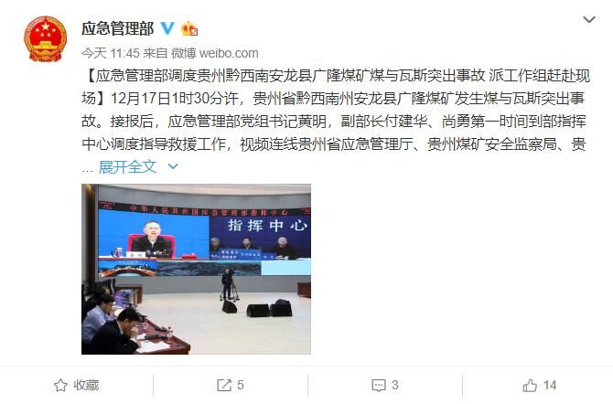 另据中华人民共和国应急管理部官方微博消息,12月17日1时30分许,贵州省黔西南州安龙县广隆煤矿发生煤与瓦斯突出事故。接报后,应急管理部党组书记黄明,副部长付建华、尚勇第一时间到部指挥中心调度指导救援工作,视频连线贵州省应急管理厅、贵州煤矿安全监察局、贵州消防和救援现场,要求全力以赴搜救失联人员,科学安全施救,确保救援人员安全;尽快查明事故原因,严惩严重违法违规生产行为;将事故情况在全国通报,督促各地举一反三,吸取教训,认真排查安全隐患,严防生产安全事故发生。应急管理部已派出工作组赶赴现场,指导开展抢险救援和事故调查等工作。