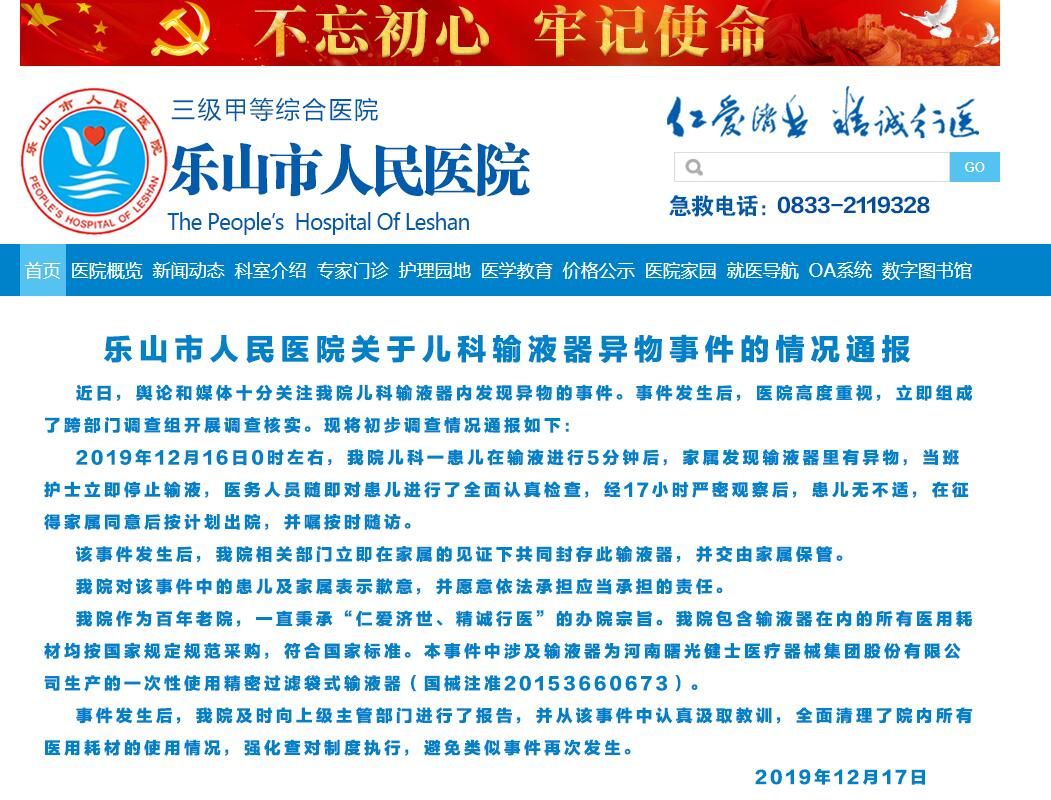 荔枝新闻讯 据四川省乐山市人民医院官方网站消息,四川省乐山市人民医院12月17日在其官网回应儿科输液器异物事件,通报全文如下: