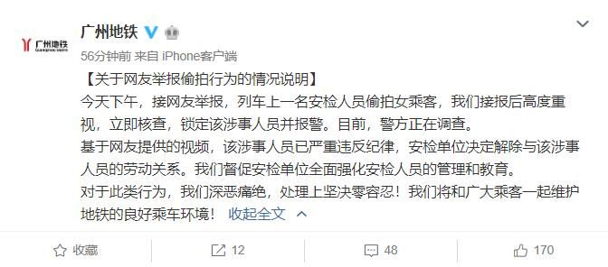 广州地铁关于网友举报偷拍行为的情况说明全文如下:
