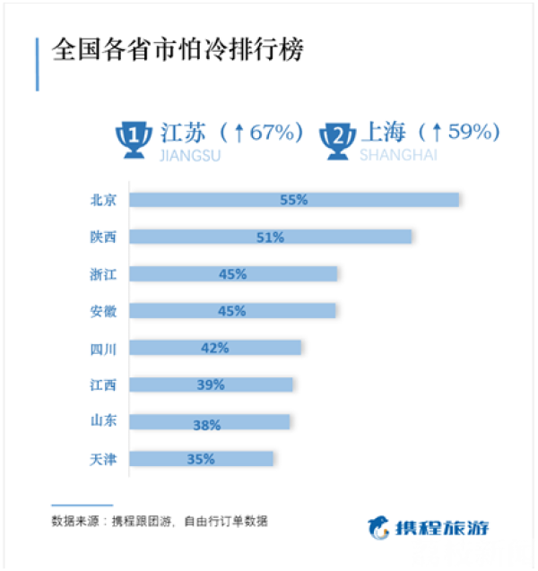 哪些地区最怕冷?从避寒暖冬游订单数据来看,来自江苏、上海、北京、陕西、浙江、安徽、四川、江西、山东、天津的订单环比增长最多,这些省市人民属于全国最怕冷的人群,江浙沪“包邮区”全部进入前十。