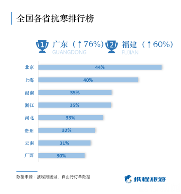 哪些城市游客最抗寒,明知山有虎,偏向虎山行?11月下旬开始,东北、内蒙、新疆、西藏、青海等冰雪目的地开始迎来冰雪季。来自广东、福建、北京、上海、湖南、浙江、河北、贵州、云南、广西的游客环比增长最多,在全国人民抗寒排行榜中位居前列。节令反差最大的广东、福建、云南、广西纷纷上榜。