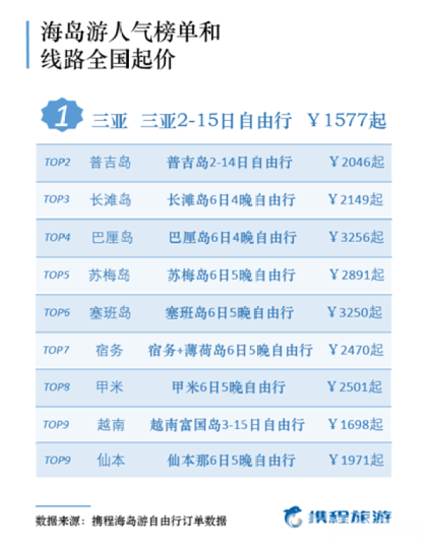 订单数据显示:11月下旬开始,预订海岛自由行套餐的订单环比增长50%以上,各大热带海岛成为冬季避寒人气之选。三亚、普吉岛、长滩岛、巴厘岛、苏梅岛、塞班岛、宿务、甲米、富国岛、仙本那成为国人海岛避寒首选。