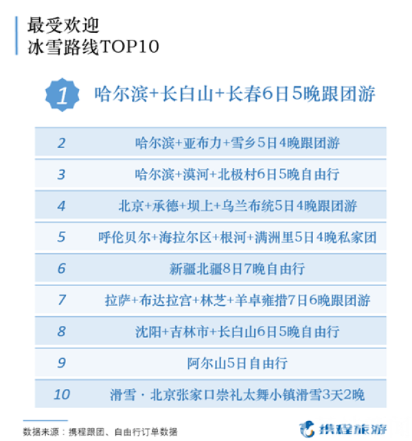 最受欢迎的十条冰雪路线分别是:“哈尔滨+长白山+长春6日5晚跟团游”“哈尔滨+亚布力+雪乡5日4晚跟团游”“哈尔滨+漠河+北极村6日5晚自由行”“北京+承德+坝上+乌兰布统5日4晚跟团游”“呼伦贝尔+海拉尔区+根河+满洲里5日4晚私家团”“新疆北疆8日7晚自由行 ”“拉萨+布达拉宫+林芝+羊卓雍措7日6晚跟团游”“沈阳+吉林市+长白山6日5晚自由行”“阿尔山5日自由行”“滑雪·北京张家口崇礼太舞小镇滑雪3天2晚”。
