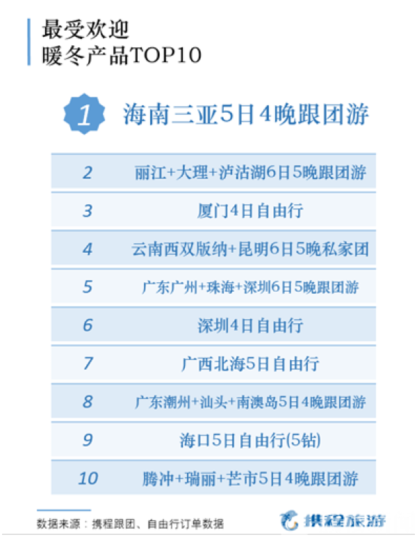此外,根据订单数据,最受欢迎的十条暖冬产品分别是:“海南三亚5日4晚跟团游”“丽江+大理+泸沽湖6日5晚跟团游”“ 厦门4日自由行”“ 云南西双版纳+昆明6日5晚私家团”“ 广东广州+珠海+深圳6日5晚跟团游”“深圳4日自由行”“广西北海5日自由行”“ 广东潮州+汕头+南澳岛5日4晚跟团游”“ 海口5日自由行(5钻)”“ 腾冲+瑞丽+芒市5日4晚跟团游”。