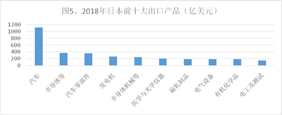 从图5的2018年日本主要产品出口结构中可以看到,汽车及零部件仍为其主要出口产业支柱,特别是在对美出口方面,2018年日本对美贸易顺差的80%左右都来自汽车及零部件领域,这还没有包括日本在墨西哥所设工厂的输美生产,以及在美工厂的生产量。