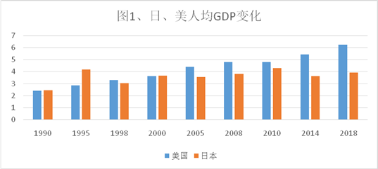 尽管2008年全球金融危机后略有缩小,但之后又继续拉大(图1)。2019年4月15日,IMF发布的最新一期《世界经济展望数据库》中相关数据显示,2018年日本人均GDP为3.93万美元,在G7国家中仅略高于意大利,已不到美国6.26万美元的2/3,日、美已不在一个层级之上。