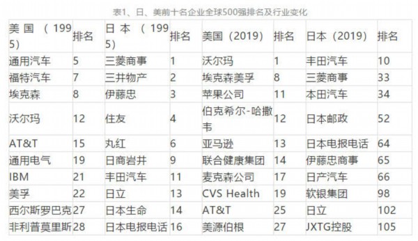 从上榜企业的行业分布看,1995年时美国主要是汽车、IT、食品健康等企业,而日本则以商社、汽车为主导。到了2019年,美国则演变为以IT、信息通信、制药等现代高科技企业为主,日本仍保持汽车、商社的传统格局,只不过商社地位有所弱化而已。