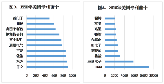 之后,美国逐步实现了赶超,韩国与中国台湾地区的IT企业也实现了快速崛起。在2018年获得美国专利数量的排名中,前20位之中只有4家不是IT及信息通信类企业,4家之中还有福特和丰田两家车企。美国在前10位之中占据了6席,而日本只有1家企业上榜,已完全处于劣势。在排名前20的16家IT及信息通信行业主导企业中,不仅没有1家日本企业,而且与1990年时前10位之间差距不明显状况形成鲜明对比的是,2018年排名前2位的IBM和三星电子的专利数要明显领先于其它企业。