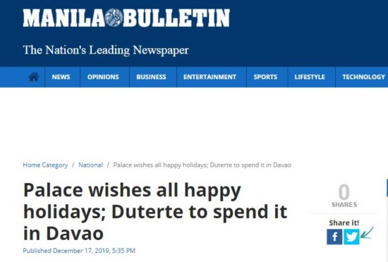 报道称,当天,帕内洛还公布了总统的圣诞行程。“和往常一样,总统将和他的家人、孙子孙女和孩子们一起在他位于达沃市的房子里度过圣诞节。”