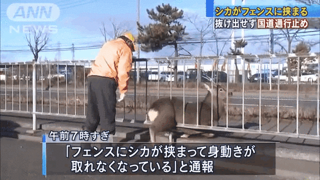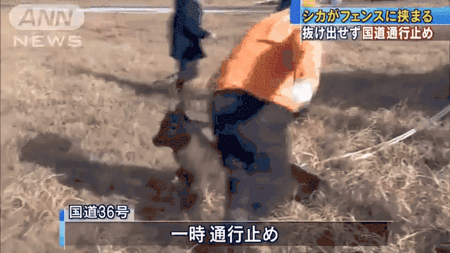 据日本朝日电视台19日报道,这起“卡鹿”事件发生在苫小牧市国道36号附近,只见野鹿上半身前倾几乎都快趴在地上,右后脚却站得挺直,屁股高高翘起,它看见有人类靠近,一度试图蹬腿逃跑,无奈屁股仍旧卡死,只好放弃挣扎,一脸“厌世”等待救援。