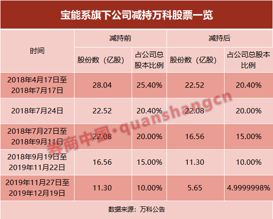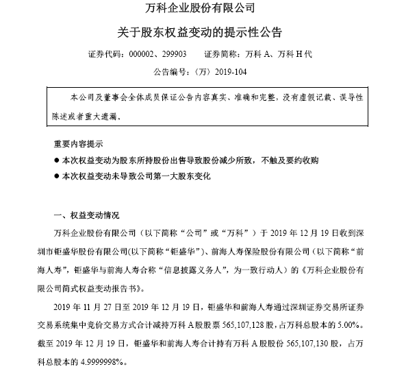2019年11月27日至2019年12月19日,钜盛华和前海人寿通过深圳证券交易所证券交易系统集中竞价交易方式合计减持万科A股股票5.65亿股,占万科总股本的5.00%。