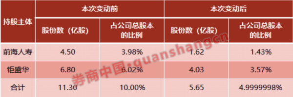 2018年4月17日至2018年7月17日,钜盛华作为委托人的相关资产管理计划以大宗交易方式、前海人寿通过深圳证券交易所证券交易系统集中竞价交易方式合计减持公司A股股票5.5亿股,占公司总股本的5.00%。其中钜盛华作为委托人的相关资产管理计划于2018年4月-7月期间以大宗交易方式合计减持公司A股5.4亿股,前海人寿于2018年5月-6月通过深圳证券交易所证券交易系统集中竞价交易方式合计减持公司A股784.6699万股。前海人寿及钜盛华合计持股比例从25.4%下降至20.4%。