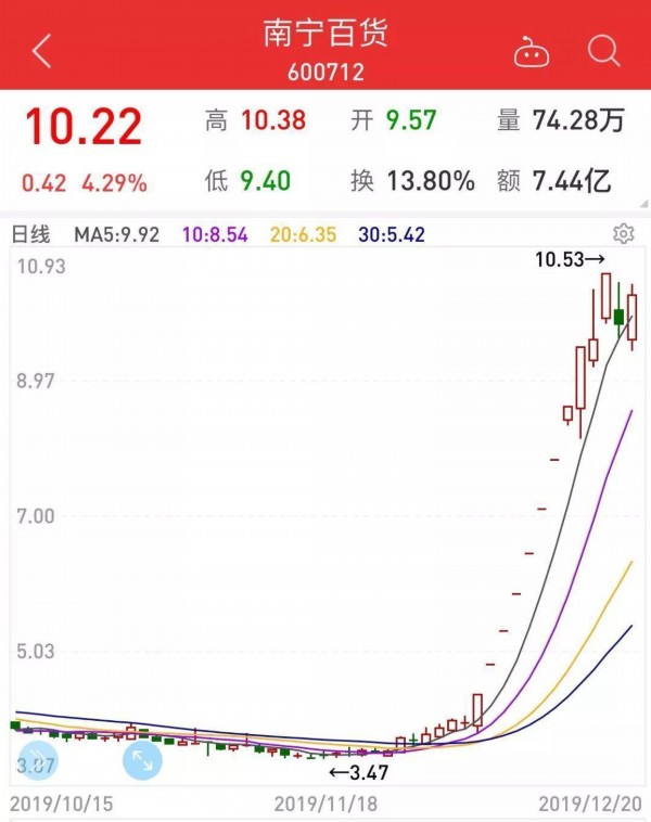 与此同时,值得注意的是,“宝能系”通过拍卖平台大举增持并一举上位成为第一大股东之后,南宁百货股价连续涨停,近11个交易日收获10个涨停板。12月18日晚间,南宁百货回复上交所问询函称,目前公司不存在正在筹划涉及公司的重大事项,也不存在其他可能对公司股价产生较大影响的重大事件;公司基本面未发生变化,日常经营情况正常。