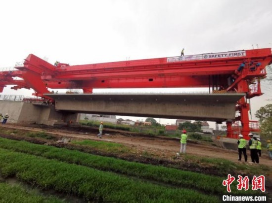 中新网合肥12月20日电(刘鸿鹤 韩新亮 李金照)据总部位于安徽合肥的中铁四局消息称,印度尼西亚当地时间12月19日,伴随着长32米、高2.6米,重达720吨的“巨无霸”箱梁精确落在了印尼雅(加达)万(隆)高铁1203特大桥370#桥台和369#桥墩上,标志着由中国中铁雅万高铁采用提、运、架设备全系统全要素的首榀箱梁成功架设。