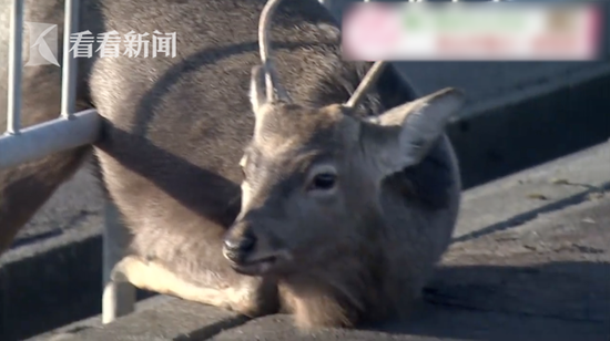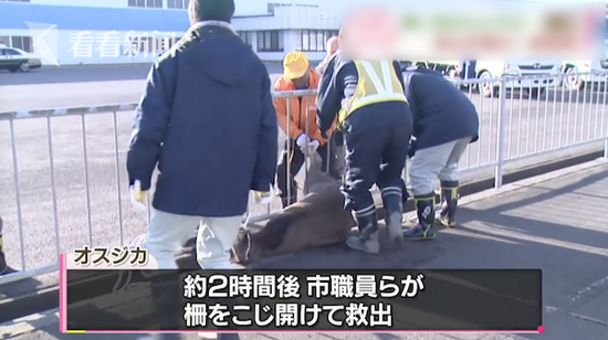 北海道苫小牧市12月19日 一只野鹿被卡在马路边的栏杆里,前半个身子都已经通过,只有屁股卡着过不去,表情看上去有些哀怨。幸好经过2小时的解救,已经顺利脱困回归大自然。