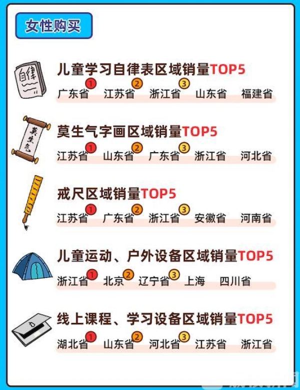 而浙江的虎妈最酷,购买儿童运动设备、户外装备最多,从小让孩子苦其心志、劳其筋骨,只盼他们长大不会轻易认输。湖北、河北、山东等高考大省的虎妈,在孩子教育上同样投入不菲,点读机、书籍、线上课程等商品购买排名靠前。