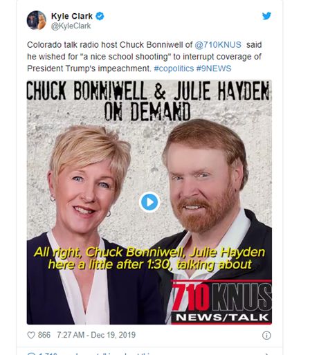 说出这话的,是美国丹佛市的保守派电台KNUS的主持人Chuck Bonniwell。根据《纽约时报》报道,当时,正在抱怨媒体对美国总统特朗普所陷入的弹劾案“没完没了”的他,突然说出了上面这句“抖机灵”的话。