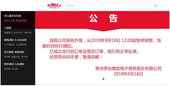 茅台电商公司官网显示,“因我公司系统升级,从2019年9月18日12:00起暂停销售,恢复时间另行通知。已成功支付的订单及售后订单,我们将正常处理。”至今停摆已3个多月。